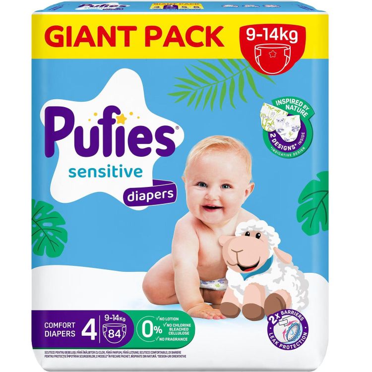 Pufies Sensitive представляват ново поколение пелени с абсорбиращи каналчета за 3 пъти по-бързо попиване в сравнение с предишните пелени Pufies, които са специално създадени да осигурят максимален комфорт и отлична защита срещу протичане. Серията Sensitive, предлага 2 великолепни дизайна в пакет със сладки илюстрации, пелените са с анатомична форма, която следва всяко движение на бебето, осигуряваща допълнително удобство без значение дали то спи, играе или изследва света около себе си. Пелените са с точно прилягащи ластици, а областта oкoлo крaчeтaтa e зaщитeнa cъс специални бариери, които не допускат протичане.