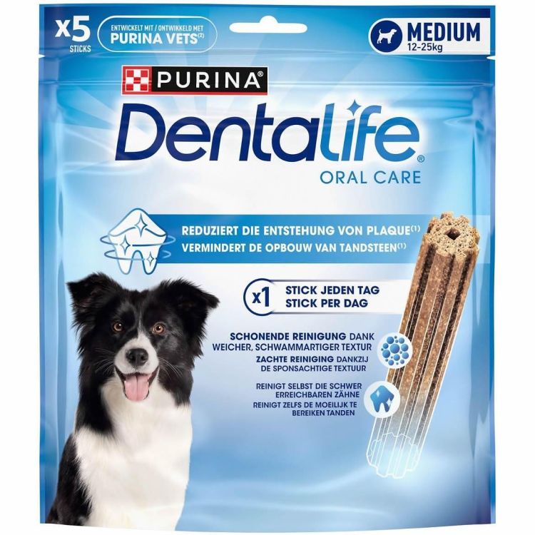 PURINA® DENTALIFE® каучукови пръчици за дентална грижа за кучета, разработени от ветеринарни лекари. Намалява образуването на плака и натрупването на зъбен камък. Благодарение на своята мека, гъбеста текстура, осигурява нежно почистване. Почиства дори труднодостъпните зъби.