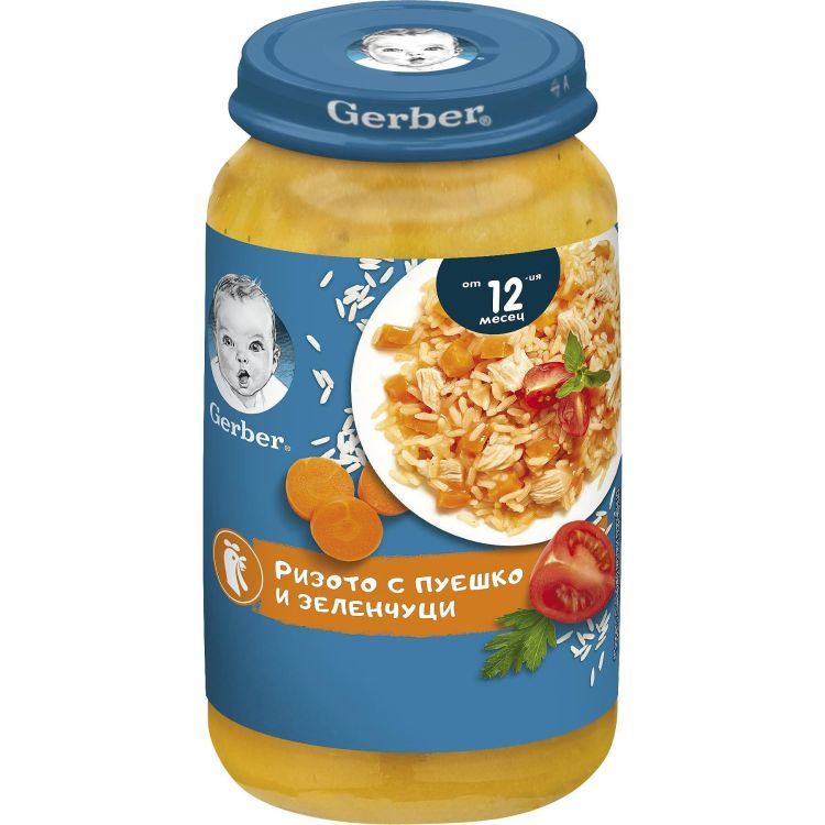Пюрето Nestlé GERBER® Junior Ризото с пуешко и зеленчуци е предназначено за малки деца след 12-и месец. Продуктът е с подходяща за възрастта консистенция, съдържаща по-големи твърди парченца, като се доближава до вкуса на храната за възрастни, но с високите изисквания и контрол, които се спазват при бебешките храни. Пюрето осигурява необходимите хранителни вещества белтъци, въглехидрати и мазнини и е походящо за деца, в чийто меню са въведени твърди храни. Съдържанието на моркови, лук както и ситно нарязан магданоз и риган обогатяват вкусовия свят на детето и допринасят за изграждането на здравословни хранителни навици. От друга страна комбинацията от пуешко месо и зеленчуци е чудесна, защото помага за изграждането на балансиранo меню на малкото дете.