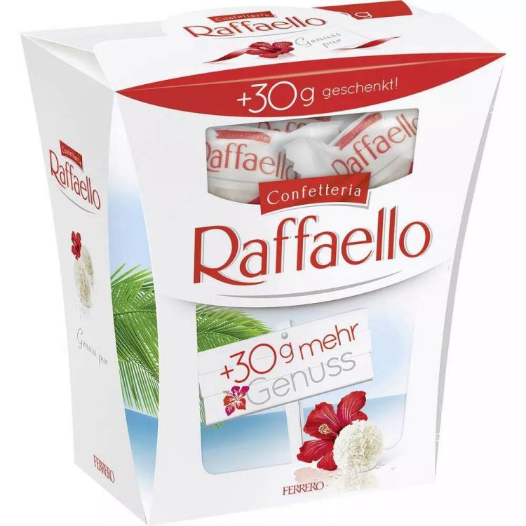 Изискани бонбони с кокос и бадем – класическият вкус на Raffaello, който съчетава лекотата на кокосовите стърготини, фин крем и цял бадем в хрупкава вафлена обвивка. Без консерванти и оцветители. Опаковката съдържа 30 г подарък (260 г + 30 г).