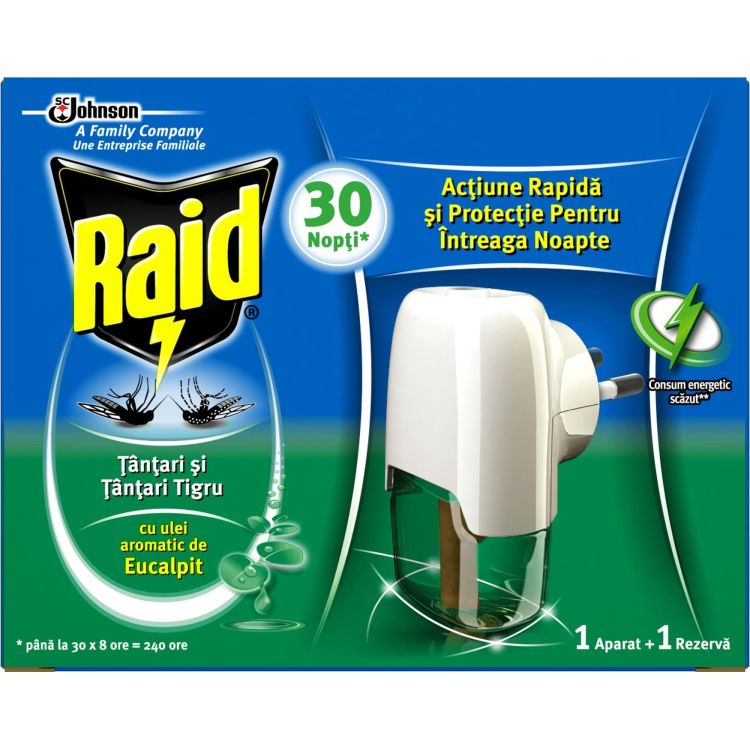 Raid е течен пълнител, съдържащ масло от евкалипт, чието предназначение е да прогони комарите, за да спите спокойно през цялата нощ. Продуктът ще Ви осигури 30 нощи защита срещу насекомите при 8 часова употреба на нощ.