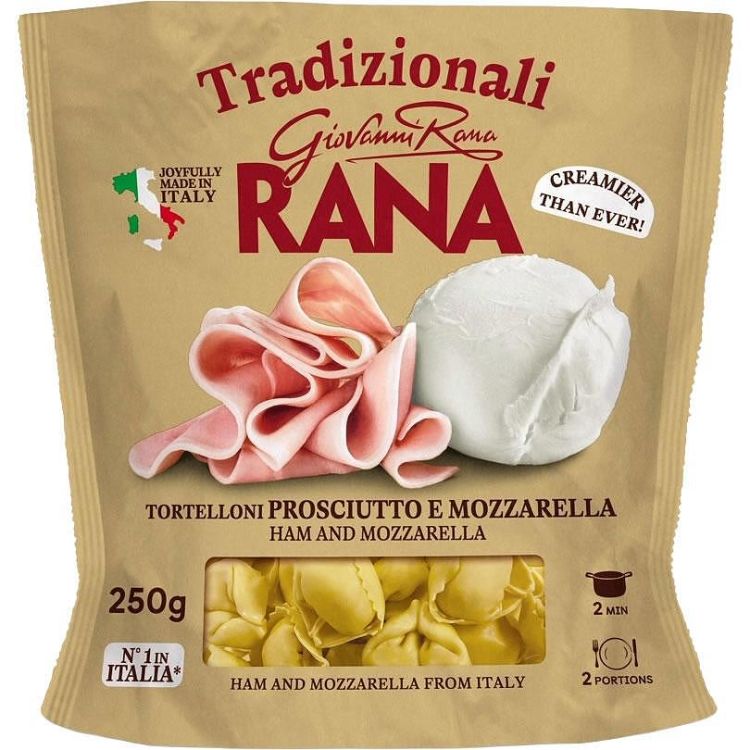 Италианската прясна паста Giovanni Rana се приготвя с яйца от свободно отглеждани кокошки и без консерванти. Сочната шунка и меката моцарела образуват вкусен, кремообразен пълнеж. Опаковката съдържа 2 порции и е готова само за 2 минути.