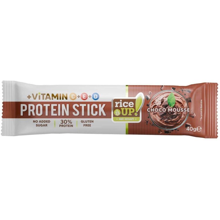 Rice Up Protein Stick е здравословен и функционален джобен снак, създаден за активния начин на живот. С 30% протеин, без добавена захар, без глутен и без палмова мазнина, този протеинов стик предлага балансирана и вкусна алтернатива за всеки момент от деня. Потопен в истинска млечна шоколадова глазура и с кремообразна сърцевина с вкус на шоколадов мус, той е удоволствие, което съчетава вкус и полза.