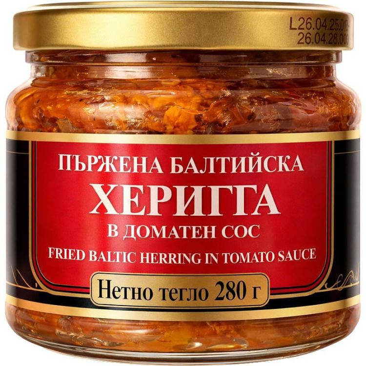 Съставки: пържена балтийска херинга, доматен сос (вода, доматено пюре, захар, рафинирано растително олио, готварска сол, луков прах, пшенично брашно, оцетна киселина – регулатор на киселинността, млени подправки: сладък пипер, лют пипер, бахар, дафинов лист, кориандър)
