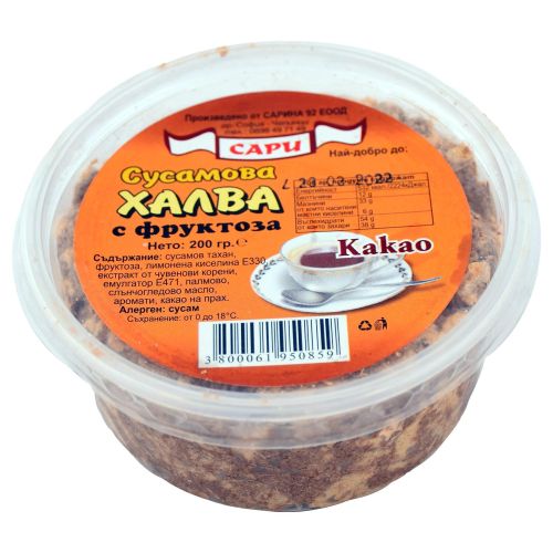Насладете се на традиционния вкус на Сари сусамова халва, обогатена с какао и подсладена с фруктоза. Тази деликатна и ароматна халва е перфектният избор за тези, които търсят балансирано сладко изкушение с богат сусамов тахан.