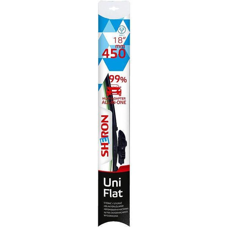 Sheron Uni Flat е модерен безрамков тип чистачка. Конструкцията ѝ действа като притискащ спойлер и няма подвижни съединения, които биха могли да блокират. Благодарение на универсалния адаптер монтажът е лесен и достъпен за всеки. Чистачката Sheron Uni Flat е съвместима с 99% от автомобилите. Гумата е обработена с графит, което удължава нейния живот, осигурява плавно почистване и намалява шума при работа.