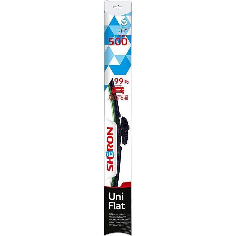 Sheron Uni Flat е модерен безрамков тип чистачка. Конструкцията ѝ действа като притискащ спойлер и няма подвижни съединения, които биха могли да блокират. Благодарение на универсалния адаптер монтажът е лесен и достъпен за всеки. Чистачката Sheron Uni Flat е съвместима с 99% от автомобилите. Гумата е обработена с графит, което удължава нейния живот, осигурява плавно почистване и намалява шума при работа.