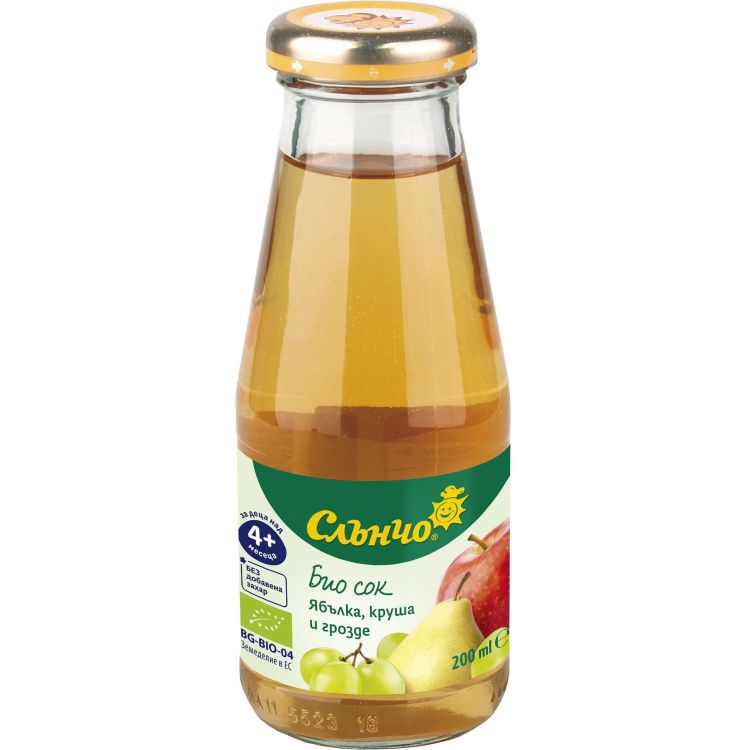 Слънчо бебешки биологичен сок ябълка, круша и грозде, 200 мл