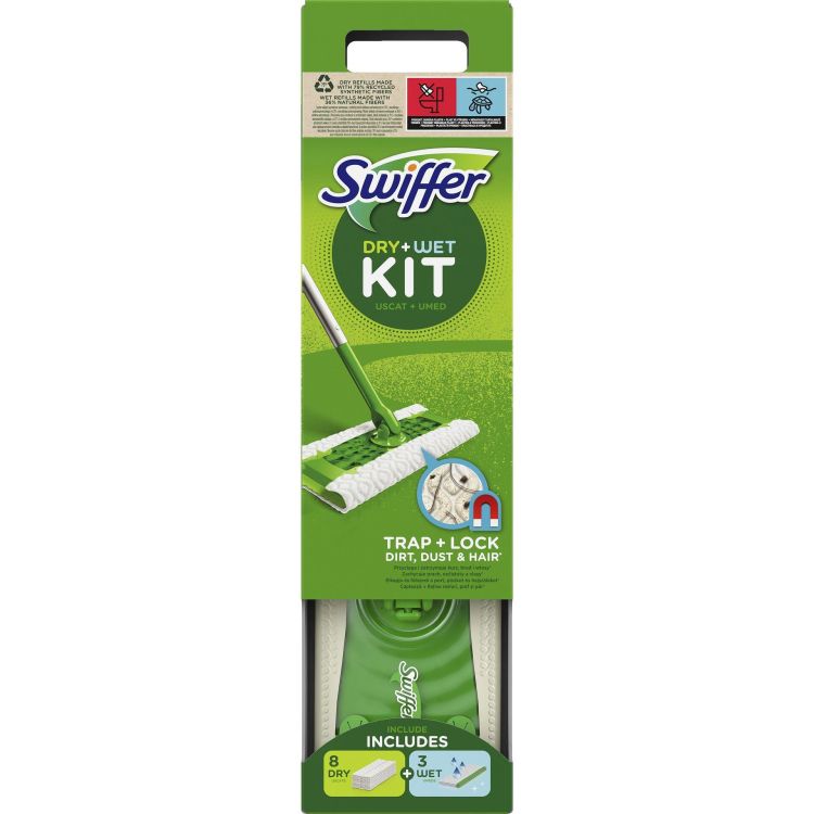 Swiffer комплект за под е практично и ефективно решение за бързо почистване на различни подови повърхности. Мопът е лек, маневрен и снабден с въртяща се глава, която достига лесно под мебели и в ъглите. Сухите кърпи улавят прах и косми, а мокрите кърпи, напоени с почистващ разтвор, се справят с замърсявания и лепкави петна.