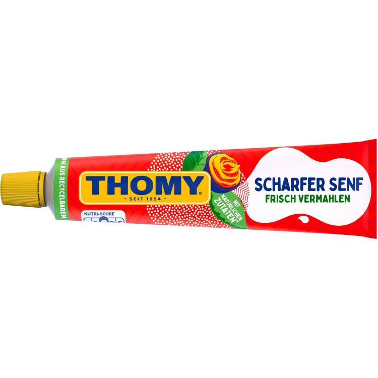 Thomy люта горчица е приготвена от цели кафяви синапени зърна, които придават естествената й пикантност и наситен аромат. Смляна е два пъти за изключителна кремообразност и фин вкус. Произведена е от естествени съставки без консерванти. Идеална е за любителите на по-люти вкусове – придава огнен акцент на стекове, рулца, колбаси, наденички или картофени салати. Продуктът е в практична и рециклируема алуминиева туба. С Nutri-Score E.