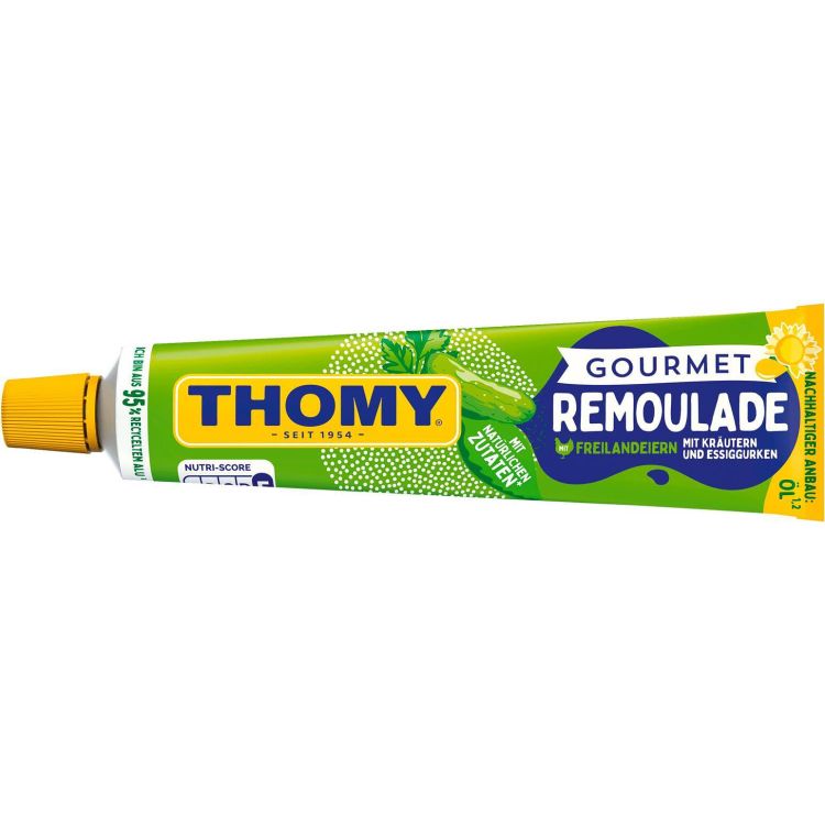 Кремообразен майонезен сос с билки, краставички и лук. Thomy ремулада гурме е фин билков сос, приготвен от естествени съставки без консерванти и оцветители. Благодарение на практичната алуминиева туба с накрайник за гарниране, сосът е лесен за използване и идеален за декорация. Перфектен е за варени яйца, риба, студено печено месо, както и като билков дип за зеленчуци на пара или грил. Подходящ е и като билкова майонеза за картофени ястия – печени, пържени или варени картофи. Тази ремулада е универсален и неустоим сос за истински ценители. Използвайте я и като допълнение към сандвичи или студени предястия. Без добавени консерванти и оцветители. Подходяща за вегетарианци.