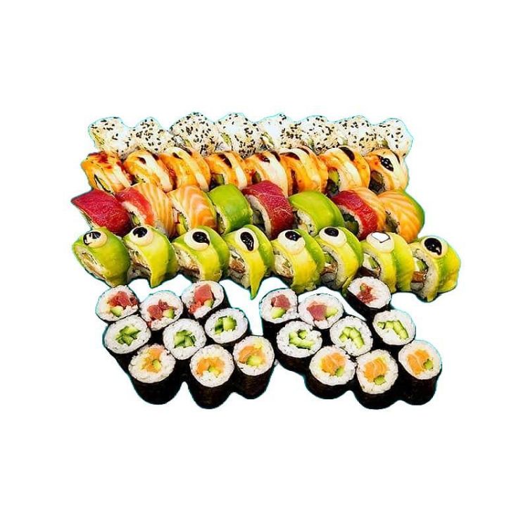 Съставки: ориз,нори,краставици, авокадо, крема сирене, риба тон, сьомга, пушена сьомга, печена сьомга, рулца от раци,сусам,японска майонеза, Унаги сос, Дракон сос, уасаби, джинджифил, соев сос, клечки за суши.